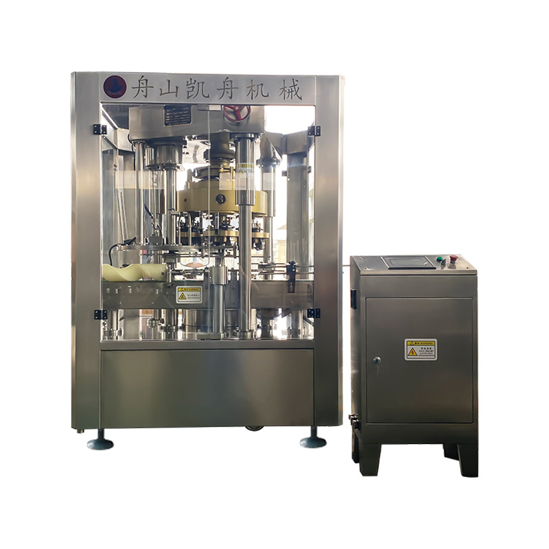 本机是一个具有四个工作头的回转式封罐机,在设计对内部的零件具有装拆方便,清洗,注油和维修操作简易等优点。机器运转平衡,能迅速使罐头的震动减少到最低限度,不存在汁液甩出的情况。两个封口滚轮相对着装置,使头道和二道封口的运转平稳,当需要检查头道的封口情况时,二道封口滚轮很容易卸开,有一个机械装置使封口滚轮恢复至原来位置。